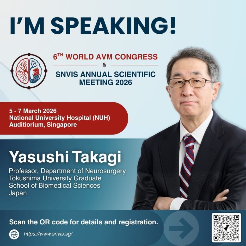 徳島大学脳神経外科髙木教授がシンガポールで開催される国際学会「6th World AVM Congress & SNVIS Annual Scientific Meeting 2026」で講演を行います。テーマはIA-ICGを用いた術中評価や3DシミュレーションによるAVM手術戦略です。AVMの手術を「どう考え、どう計画し、どう安全に行うのか」。最先端の技術を臨床にどのように活かしているのかを、国際舞台で発信します。