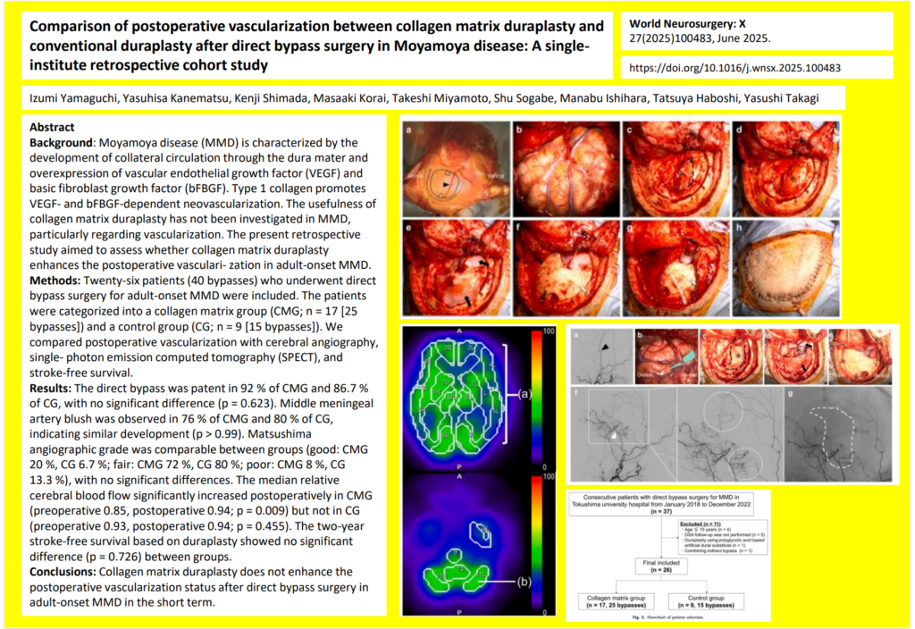 もやもや病に対する直接バイパス術後の硬膜形成において、コラーゲンマトリックス使用と従来法の血管新生を比較した単施設後ろ向き研究。